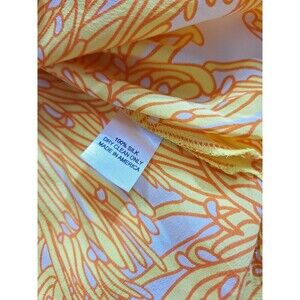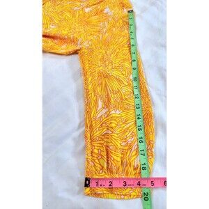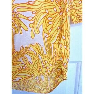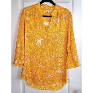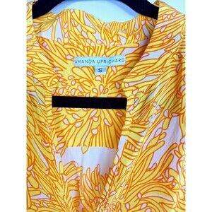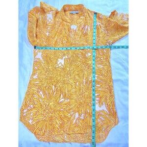 This is an Amanda Uprichard Sunflower Silk Blouse in size Small. It features a floral pattern, a V-Neck neckline, 3/4 sleeves, and a casual sleeve type. The blouse is made of lightweight and breathable silk material, suitable for all seasons. With a tunic style and gold exterior color, it offers a designer, colorful, and bohemian theme perfect for a classic or tropical look.