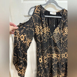 This is a listing for a preowned tags still attached, Amanda Uprichard Tan Black Snake Skin Print Dress Shoulder Cut Out Size Small . Great condition, approximate measurements in photos. Cold shoulder cutout, gathered sleeve hem. Please see all photos for details as they are part of the description.