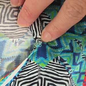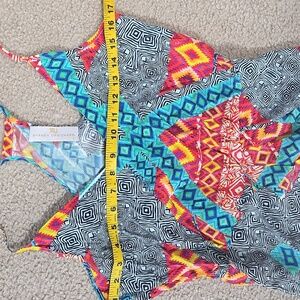 Vibrant Amanda Uprichard maxi dress with geometric and tribal patterns. Features a mix of blue, red, and yellow colors. Size small. V neck, racerback, tulip hem maxi dress. 100% silk, fabric has no stretch. Dry clean only. Elastic at waist. There is a small tear at the top of the v neck on the front of the dress. Please see photos. It is barely noticeable and looks like it would be an easy fix for someone who sews. Beautiful dress for spring, summer, resort, or even a festival.