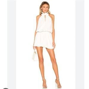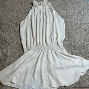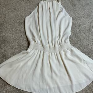 Elegant white mini dress. Halter neckline. Flowy silhouette. Perfect for any occasion.