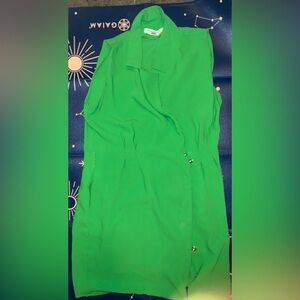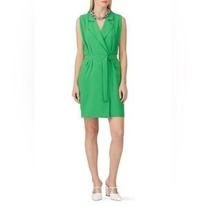 Green crepe (97% Polyester, 3% Spandex.). Hourglass. Sleeveless. V-neckline. Hidden front snap button closure. Attached belt. 35" from shoulder to hemline. Made in the USA.