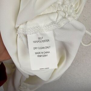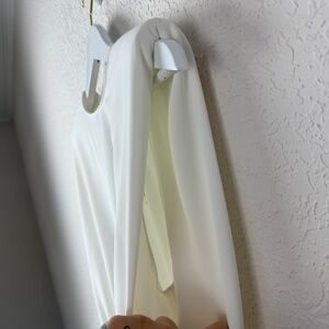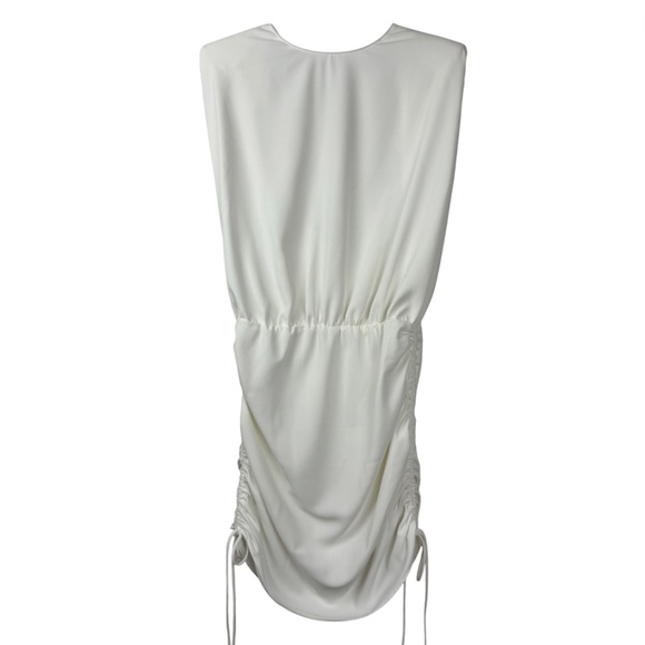 Elegant Amanda Uprichard sleeveless dress in a soft white/ivory tone. Features a flattering elastic waist, adjustable ruched sides with drawstrings, and a sleek midi length silhouette. Lightweight fabric with a smooth drape, perfect for bridal events, rehearsal dinners, showers, vacations, or elevated everyday wear.