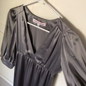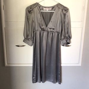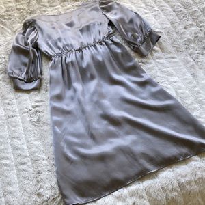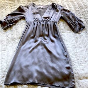 Gorgeous shiny satin dress in a steel gray/chrome color. Simple, understated, and perfect to pair with strappy heels and a bit of bling! Could be great for a dance, a wedding, or any dressy party. Please see photos for a small spot where the stitching has been pulled (an easy fix for a tailor or for you if you’re handy with the needle and thread!) Otherwise EUC