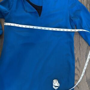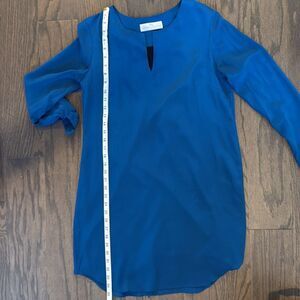100% silk Amanda Uprichard dress. Long sleeves, above the knee length with a curved hem, lined. Color is a rich dark teal (it looks a little more royal blue than it is in the pictures). Has a ruffle that goes down the entire back, giving it a little something extra. Could easily dress up or down.