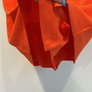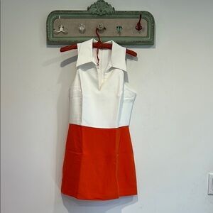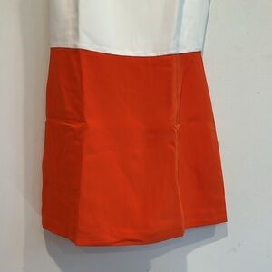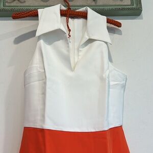 Stylish sleeveless dress with a white top and vibrant orange skirt/skort. Features a classic collar and a sleek design.