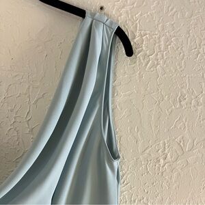 In excellent used condition no rips, tears or stains. Maxi length dress in a thyme green color, draped neckline, high side seam slit, crepe fabric, unlined and hidden side zipper closure.