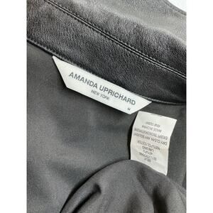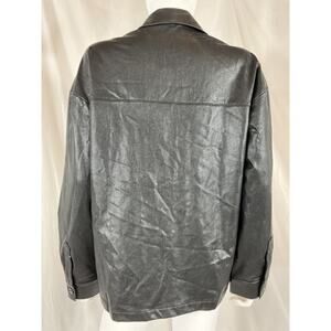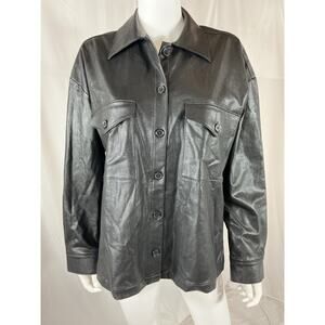 Amanda Uprichard x Revolve 'Hollis' Black Viscose Shacket Size M: faux leather fabric, front button closure, button cuffs, breast flap pockets, measurements: 22 inch bust x 26 inch length.