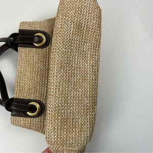The Amanda smith shoulder bag features a beige woven straw and faux leather exterior with brown faux leather double handles. It has a spacious interior with a brown lining, zippered pocket, and slip pockets. The bag closes with a magnetic snap. Suitable for casual outings, shopping trips, or everyday use. Pre-owned. Good clean condition