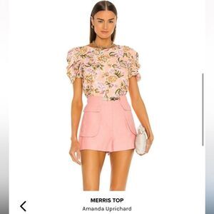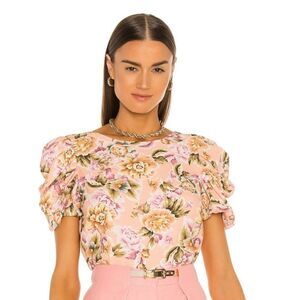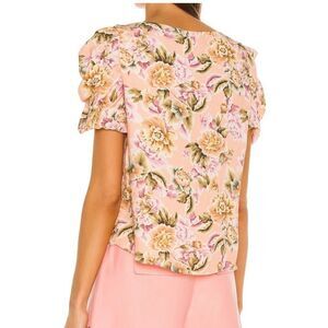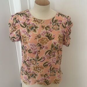Elevate your style with this elegant floral puff sleeve top. The pink and cream hues create a soft, feminine look. Perfect for any occasion. Great for work.
