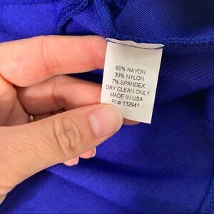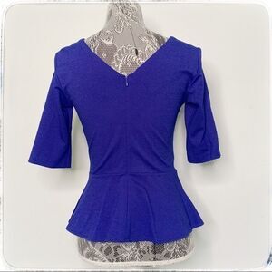 Great royal blue peplum style top by Amanda uprichard. Perfect to dress up or down. Figure flattering and in excellent preowned condition. Lying flat armpit to armpit approx 16” across and top of shoulder to bottom hem approx 21”. Has great stretch. All measurements are approximate