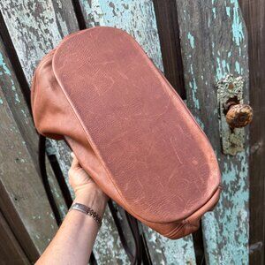 Measures 11" tall at center and 14" wide.. Base is 13 1/4" by 6". Two double pockets inside. Spring clasp. Strap measures 32".