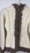 Such a cozy, cute sweater! Handmade cable knit cardigan features a hood, zip up front closure, and contrasting dark brown woolly fringe along bottom of sleeves, hemline, hood, and front closure. Sweater is a cream color with two slip pockets located on front. Large cable knit detail on front, sleeves, and back. The silhouette is fitted and there are belt loops but the belt is missing.