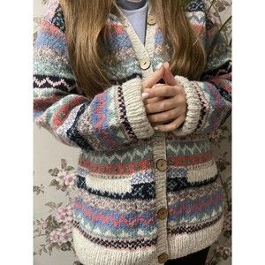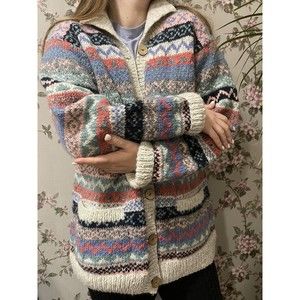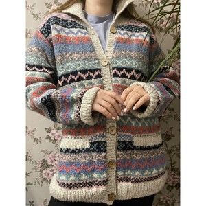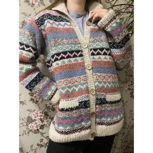 Amano Style Pachamama Hand Knitted Wool Folk Cozy Pockets Cardigan Sweater L