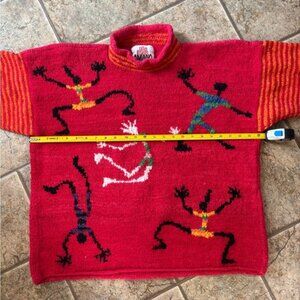 Amano Vintage We The People 100% wool hand knit sweater. Amano only made one size in this sweater, measures 24” pit to pit and approximately 24” in length as seen in photos. In very good used condition with light wear. Red in color with orange striping on the mock neck collar and sleeves. Stick figure design on front and back.