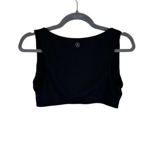 Excellent preowned condition. Black wide strap high mesh back full coverage pullover unpadded sports bra. Does not come with pads, but can put in. Brand lettering is peeling (as pictured). Body is recycled polyester/spandex, mesh is nylon, lining is nylon/spandex. Approx. measurements: Shoulder to hem 11", pit to pit 15.5", band across 13.5". Size L.