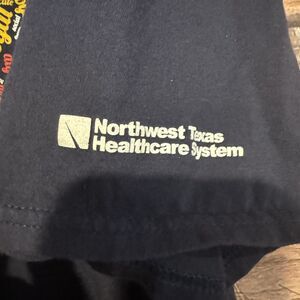 Color: Navy blue shirt with a vibrant circular word-cloud graphic on the front.