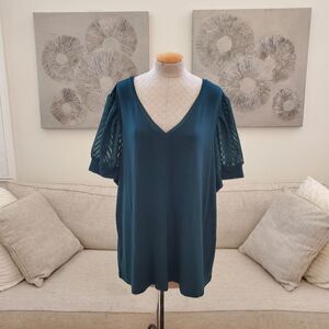 Casual puff-sleeve top that features a flattering V-neckline and intricate lace details.