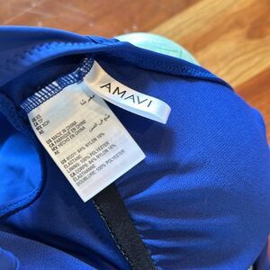 Super cute blue mono, Kini with gold hardware and ruffle details, halter style neck, moderate coverage bottom with rushing