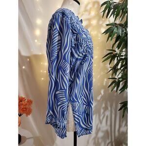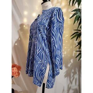 Amaya 100% Silk Split Neck Embroidered Tunic Blouse Womens Size 38 US Small Zebra Stripe Top Blue White