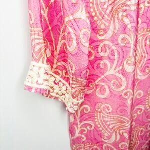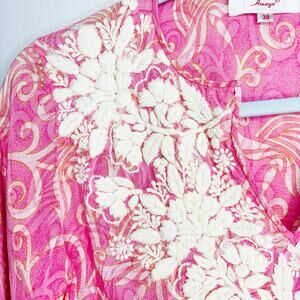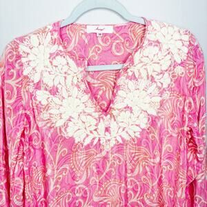 Amaya Pink Silk Tunic Size 38/M Floral Embroidered Neckline Cuffs Scroll