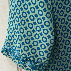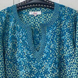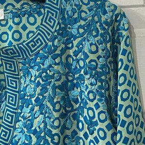 Amaya Women's Silk Sz 42/ US L Tunic Long Sleeve Turquoise Geometric Embroidered