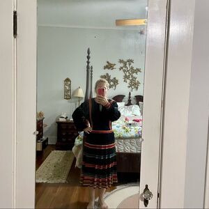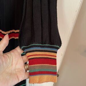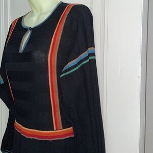 Vintage 70s Roncelli brand black ribbed acrylic/wool sweater dress long sleeved midi dress with full skirt & key hole neck that zips up back and has orange, red, blue, green & tan stripes throughout