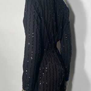 Sequins and jumpsuits just go together. Black polyester jumpsuit with bell bottom opening at leg and tie closure at waist. Polyester zip front. Jumpsuits can sometimes be a fit thing in the torso please check measurements. Hem can come up from inseam if needed. Necklace not included and for photo only.