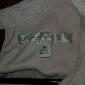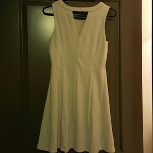 Color is a light eggshell. Very soft and comfy dress that goes just above the knee. Pictures are as follows: front, back, label