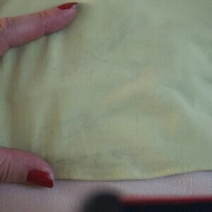 There is some discoloration on the bottom, like a blueish tone. Please see the closeup pictures. It is not super noticeable. Other than that, this dress is in great shape.