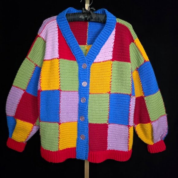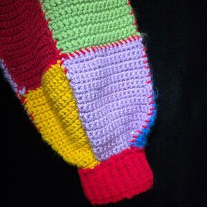 Excellent pre-loved condition! Because it's handmade, there are a few yarn ends that may stick out (see last photo). No size tags so please look over measurements carefully. I'd say it's a 2X. Colors are Blue, Red, Green, Lavender, Pink, Yellow.