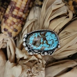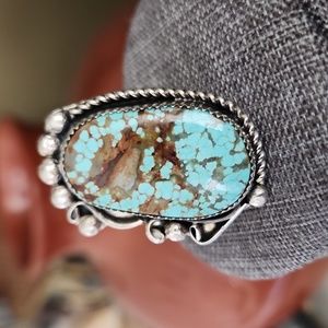 Absolutely stunning large Native American Navajo handmade turquoise and sterling ring is in excellent, never worn condition. Stunning bright turquoise blue with brown matrix on sterling mount with bead and rope design surrounding the stone. Big stone measures approximately 1 1/4" by 3/4". The ring measures approximately a size 8 but can be adjusted to a smaller size. Ring is signed by artist and marked sterling on back. A truly exquisite statement piece! From non-smoking home. π©΅ππ€