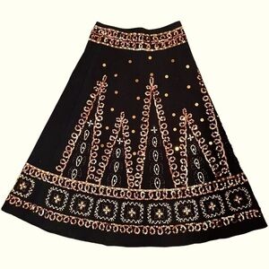 Paris Paris is a little designer boutique in Scottsdale of Parisian designers of clothes made in in Italy or Indonesia. This skirt has the richest most amazing 🤩 colors of warm coffee and gold throughout the design and embellishments. I hesitate to even sell it 😳! It gives off this feeling of luxury and decadence to me. Style it numerous way. A tan tank or a sweater or a gold bralette depending on where you want to go. Boots would pair great for winter, heels or sandals for summer. Like new condition. Fully lined. In my closet but I have so many clothes I haven’t worn it myself yet. Working from home it’s time for me to downsize and make space.