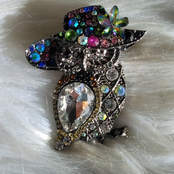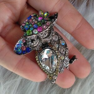 Sparkling owl brooch with multicolored rhinestones. Features a large clear gem and intricate detailing.