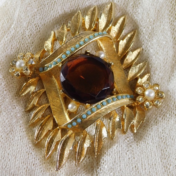 Amazing Vintage ART Signed Topaz Glass Stone Pearl and Glass Cabochon Brooch