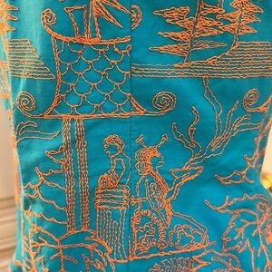 This gorgeous, and I believe vintage sheath dress is labeled with both Hartly Westwood and TOCCA tags. It is heavily embroidered with an Asian Geisha, landscape with suns, clouds and mountains with Geisha holding a steaming bowl. Amazing detail! Dress is 100% cotton. Size tag removed but I believe is size 4 as it did not zip all the way up my size 6 mannequin. Teeny rip at base of zipper, easily stitched.