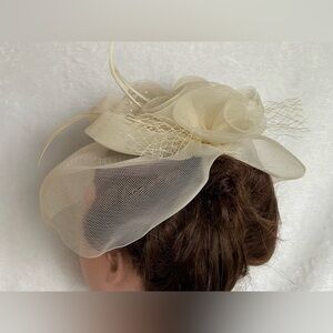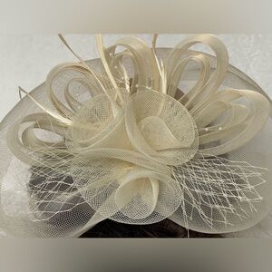 Beautiful cream, color with feathers and fake pearls with gorgeous tool flowers rolls. Please look at all pictures and ask questions. I am happy to help. This is in absolutely wonderful condition.