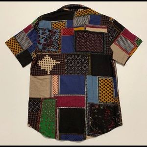 •Amazing patchwork-like button down shirt. TAGGED SIZE LARGE, BUT MORE LIKE A MEN’S SMALL!! Would be an amazing shirt to wear tied into a crop top•