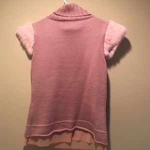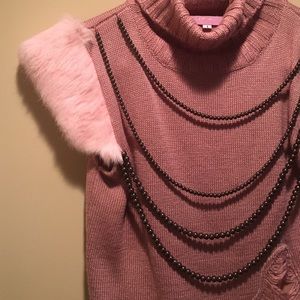 Pink knit sweater with faux fur on the sleeves. Turtle neck. Cap sleeves. Bead detail attached to sweater. Shred detail in front. Pink mesh trim at bottom.