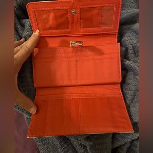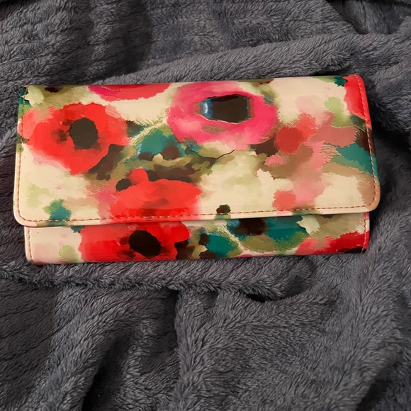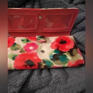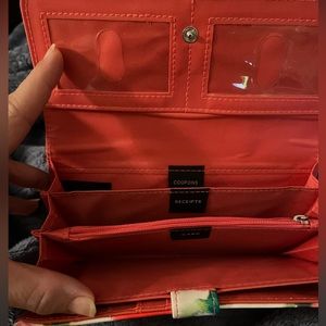 Water color look wallet floral. Tons and tons and tons of compartments. It has a section that is labeled coupons, receipts, cash, zipper section for change. 12 credit card slots. Excellent used condition. Main color is pink