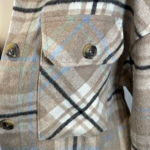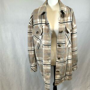 Create so many looks with this plaid shacket oversized button up jacket. It is oversized and very cozy. Has a small bit of wool for the soft fuzzy outside feeling. Perfect for the fall and winter weather. Euc