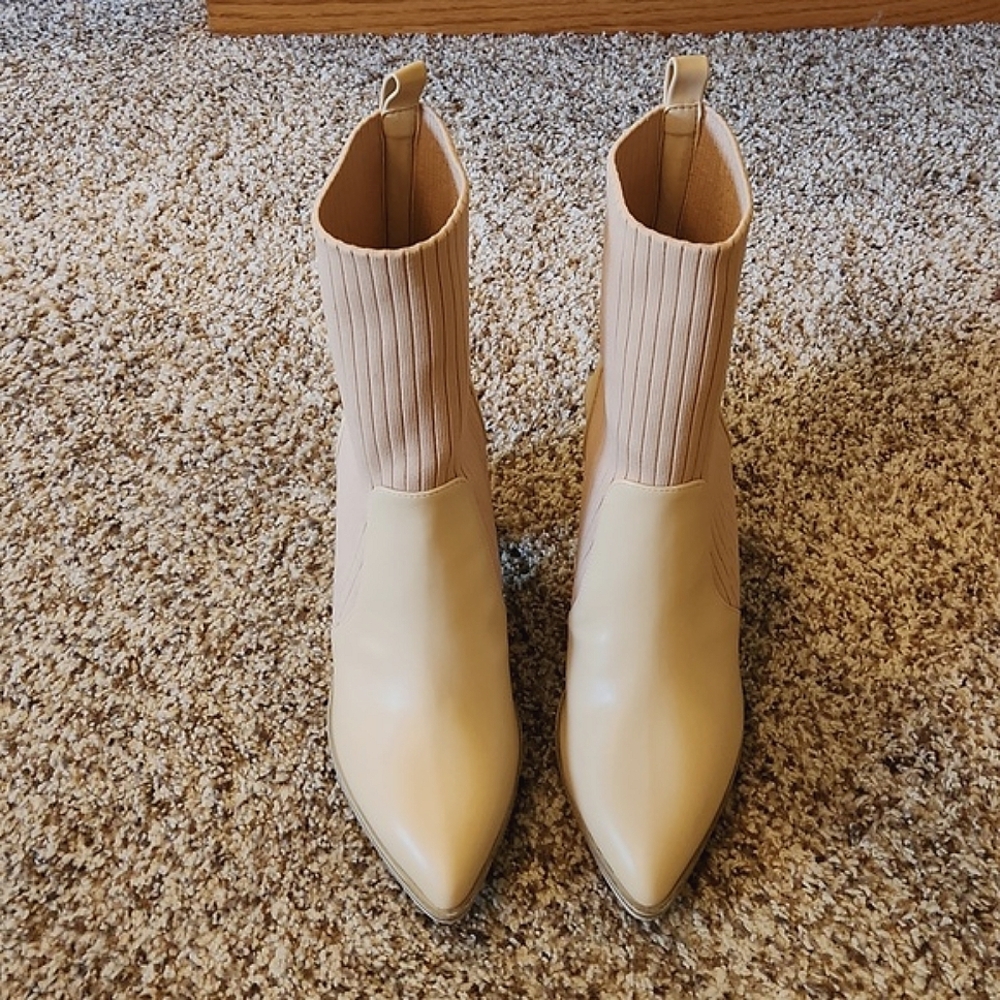 NWOT - cream, pointed toe ankle boots, square heel, brand new, never worn, perfect condition. purchased from Amazon. fun, statement boots.
