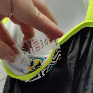 Soft cup bra with removable pads. Loose fitting black bodice with multicolor sports type bra underneath. In new without tags unworn condition. Highly rated brand on Amazon. Top only, pair with any swim bottom