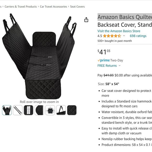 Amazon Basics Quilted Water Resistant Hammock Car Backseat Cover, Standard, 58" x 54"