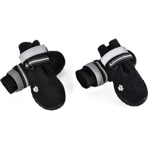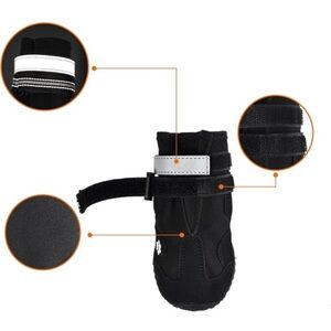 Each set includes 4 black polyester dog boots that are waterproof and bite resistant, providing durable strength for dogs weighing between 40 and 55 pounds. The anti-slip grooved sole offers extra traction and stability, while the reflective material enhances visibility for added safety.