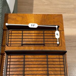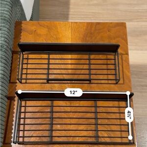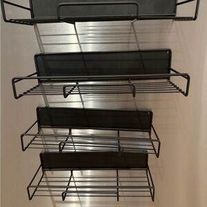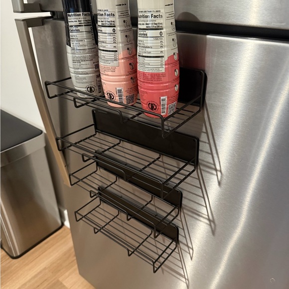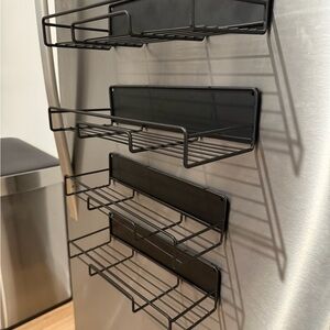 Magnetic storage rack. Holds bottles securely. Sleek black design. Ideal for kitchen organization.