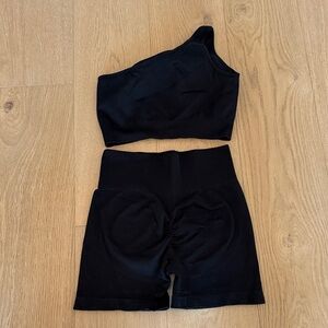 Two-piece active set. One-shoulder crop top with supportive band. High-waist ribbed biker shorts. Stretchy, breathable fabric for workouts or lounge. Sleek, minimalist design.