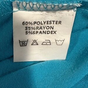 Amazon women’s blouse in vibrant blue with delicate white crochet lace short sleeves for a feminine touch. Made of a soft, stretchy blend of 60% polyester, 35% rayon, and 5% spandex, offering breathable comfort. Features a V-neckline and relaxed fit, perfect for casual or dressy occasions. Previously owned, good condition.