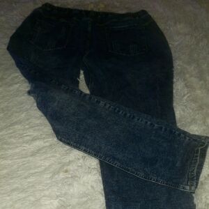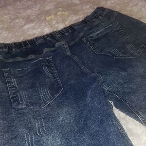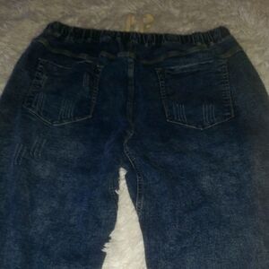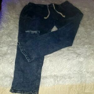 These Amazon jeans feature a deep blue hue with intentional distressing for a modern, laid-back style. The elastic waistband with visible drawstring cords offers a comfortable and adjustable fit, perfect for casual outings.