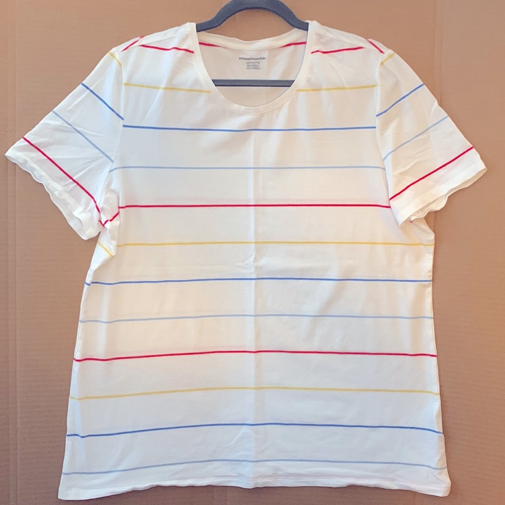 This is a 2XL, short-sleeve, striped t-shirt. It is white with alternating red, yellow, light blue, and dark blue stripes. It is new without the tags and only washed once.