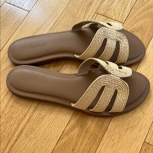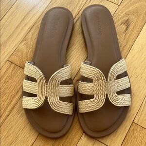 Chic and comfortable sandals. Features woven beige straps. Ideal for casual wear. Like new. Barely worn.